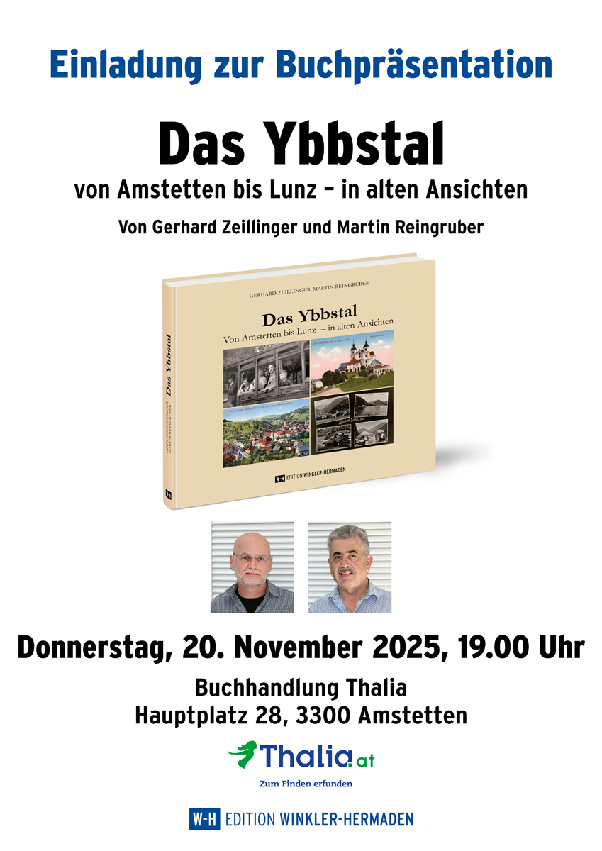Jetzt gibt es das Buch „Das Ybbstal“! Anhand von mehr als 100 historischen Aufnahmen führen Gerhard Zeillinger und Martin Reingruber durch die elf Ybbstalgemeinden: Amstetten, Allhartsberg, Kematen, Sonntagberg, Waidhofen an der Ybbs, Ybbsitz, Opponitz, Hollenstein, St. Georgen am Reith, Göstling, Lunz am See. Eine spannende historische Entdeckungsreise erwartet Sie!
