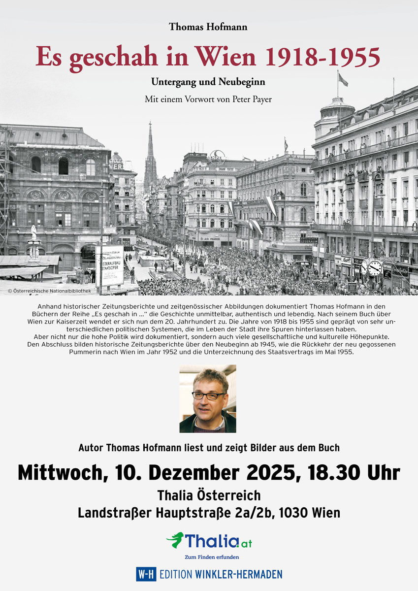 Anhand historischer Zeitungsberichte und zeitgenössischer Abbildungen dokumentiert Thomas Hofmann in den Büchern der Reihe „Es geschah in …“ die Geschichte unmittelbar, authentisch und lebendig. Nach seinem Buch über Wien zur Kaiserzeit wendet er sich nun dem 20. Jahrhundert zu. Die Jahre von 1918 bis 1955 sind geprägt von sehr unterschiedlichen politischen Systemen, die im Leben der Stadt ihre Spuren hinterlassen haben.